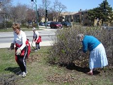 The Northtown Garden Society assumed the responsibility for the maintenance of the Chicago Park District rose garden on the corner of Pratt and Ridge Avenues in Chicago. The garden was in need of TLC so a group of NGS volunteers pruned, cleaned, edged, weeded, and mulched the bed in early May.